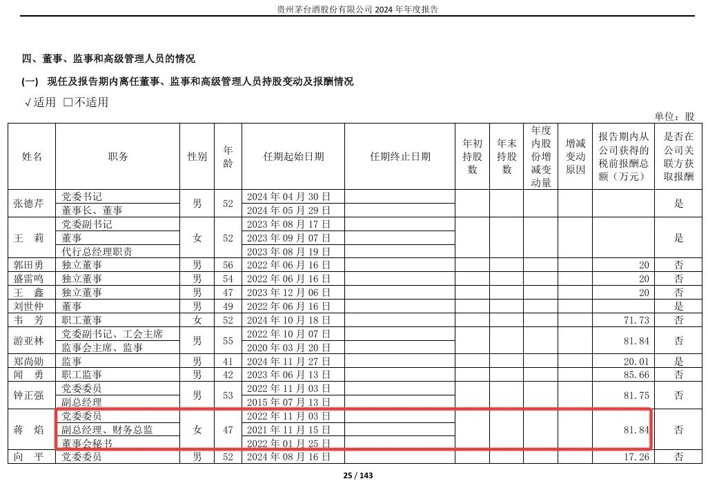 2026年3月13日,据“廉洁遵义”消息,贵州茅台酒股份有限公司党委委员、副总经理、财务总监、董事会秘书蒋焰涉嫌严重违纪违法,目前正接受贵州省纪委监委派驻贵州茅台酒厂(集团)有限责任公司纪检监察组纪律审查和遵义市监委监察调查。