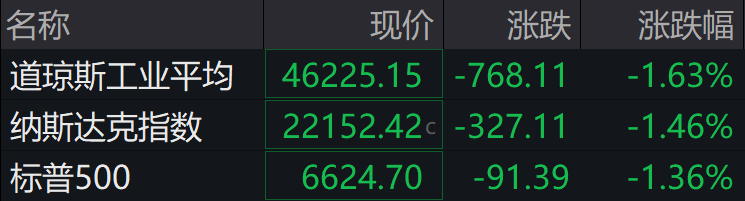►►当地时间周三,美股三大股指全线下挫,截至收盘,道指跌1.63%,创年内新低,纳指跌1.46%,标普500指数跌1.36%。